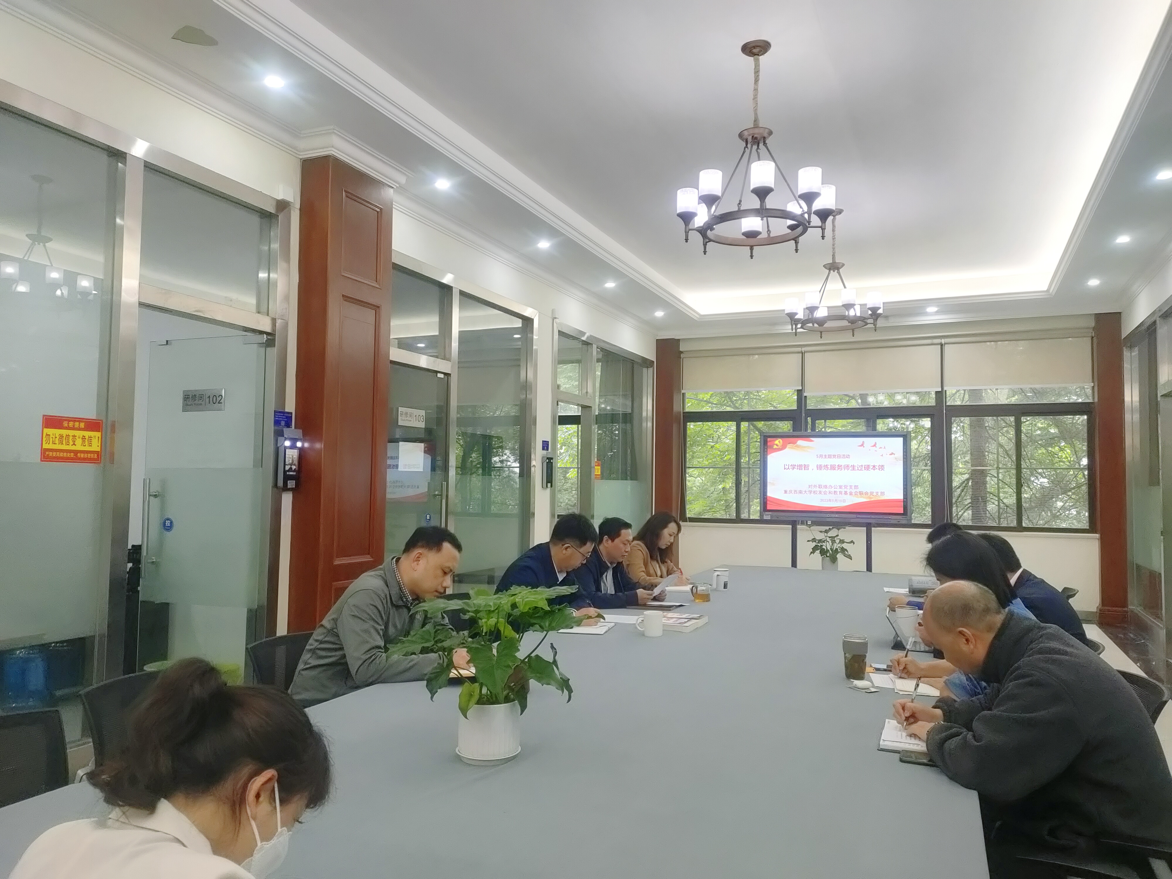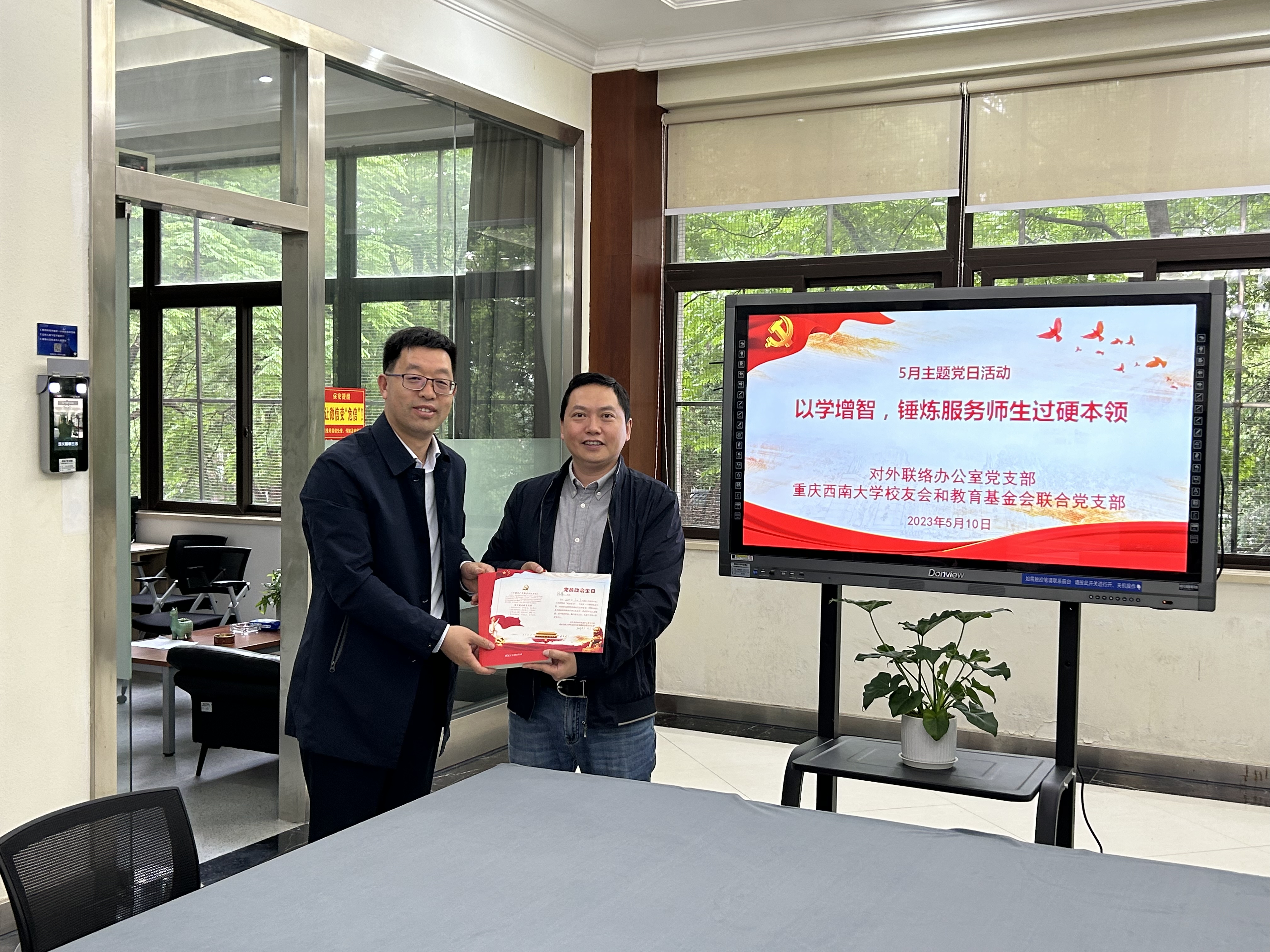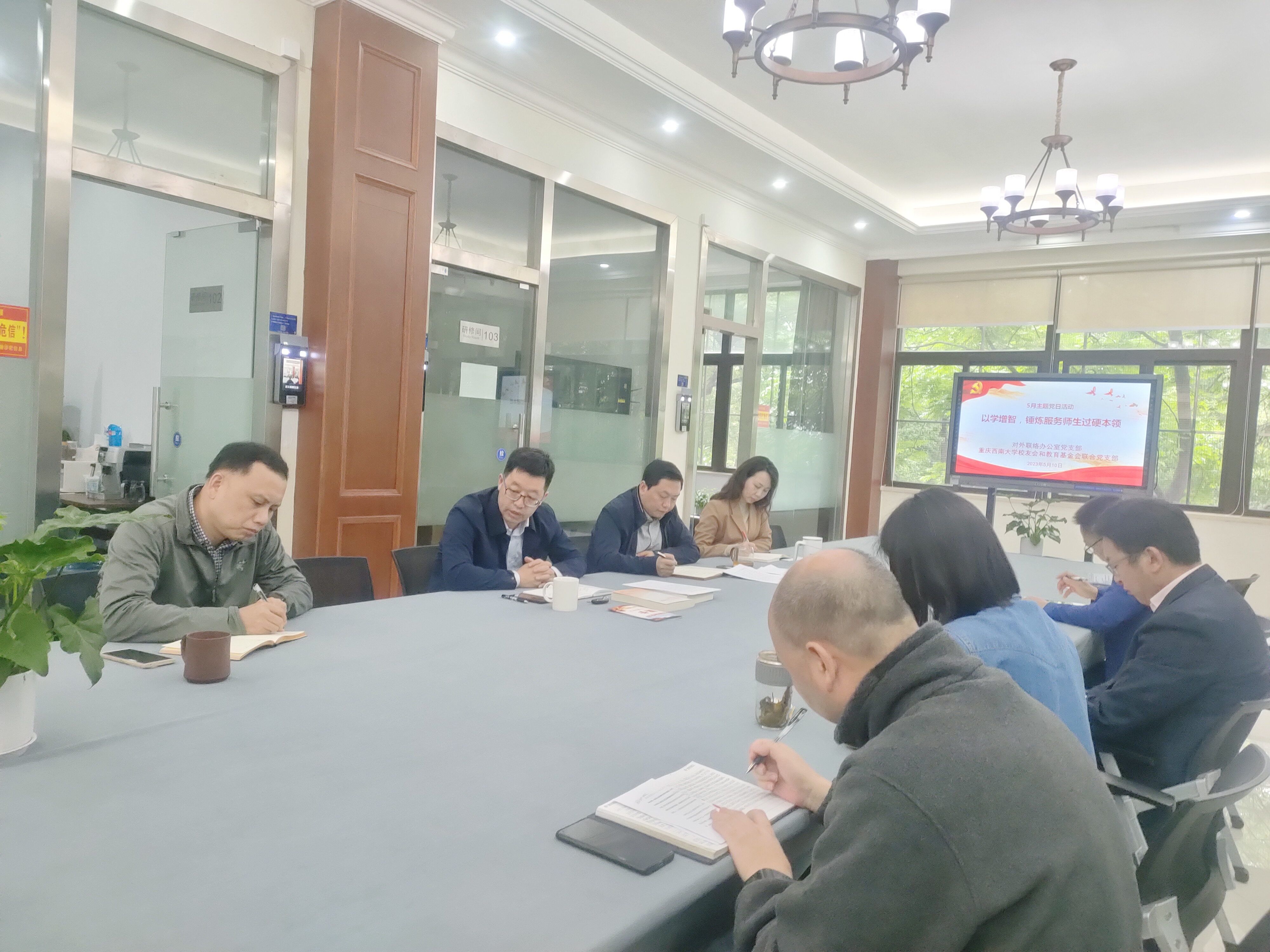 2023年5月10日下午2:30,对外联络办公室5月主题党日活动暨党员大会在北区图书馆逸夫楼1楼召开。活动主题是:以学增智,锤炼服务师生过硬本领。党日活动由支部书记唐军同志主持。