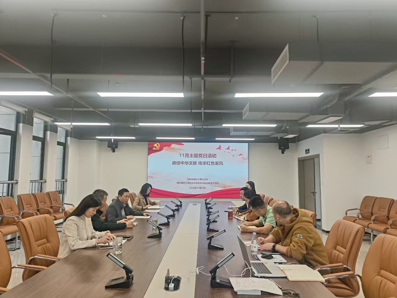 2024年11月15日上午,对外联络办公室11月主题党日活动在对外联络办公室会议室召开。活动主题是:赓续中华文脉 传承红色家风。党日活动由支部书记唐军同志主持。市教育行业社会组织党建工作指导员喻尚其、党委研究生工作部副部长周敏列席会议。