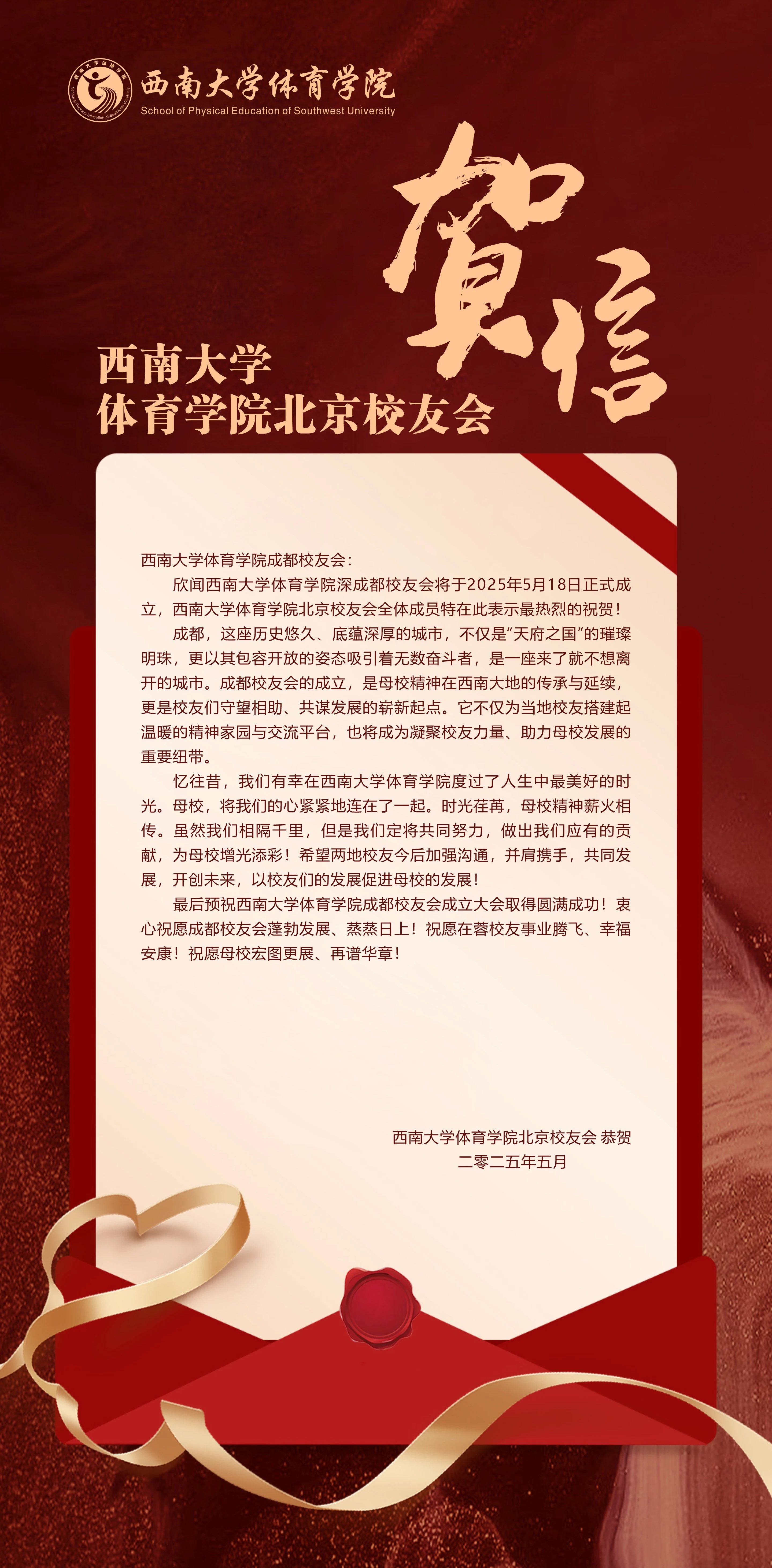 2025 年 5 月 18日,betway西汉姆联体育学院成都校友会成立大会顺利召开。betway西汉姆联体育学院党委书记罗义文、院长黄晓灵,betway西汉姆联对外联络办公室副主任冉江渝,体育学院张剑兰副书记、郎君副院长、王雷副院长、校体委办公室主任鲁冠等相关工作人员,以及betway西汉姆联兄弟院校、兄弟校友会代表参加了本次活动。