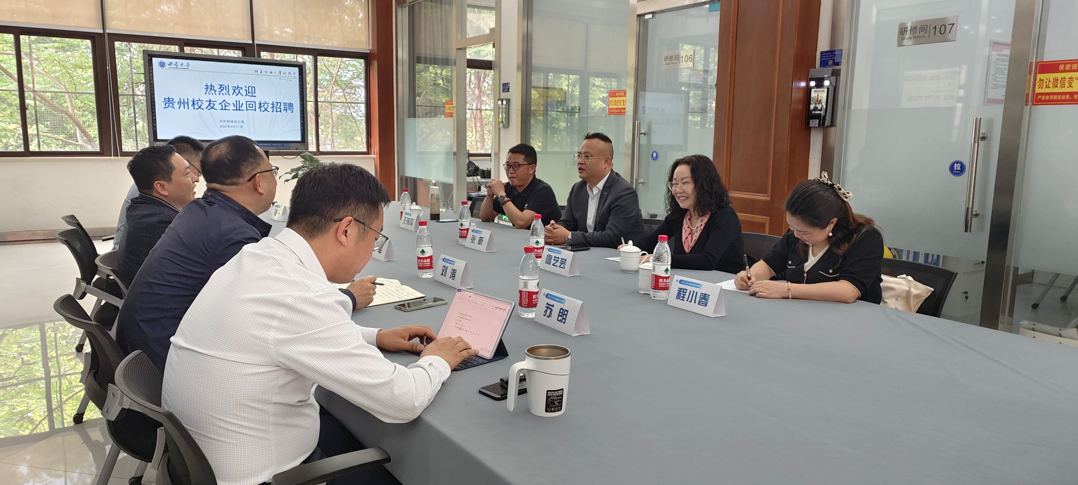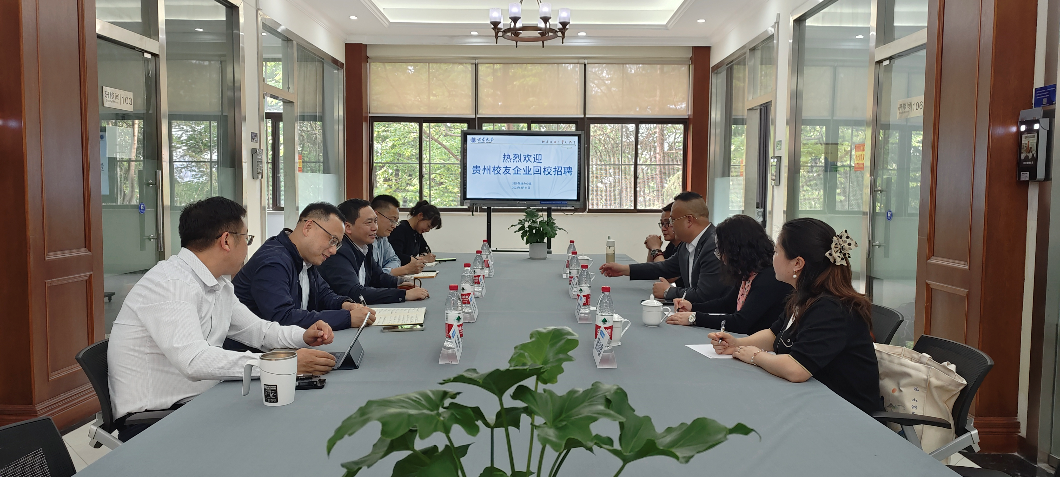 4月11日,贵州赛福工程建设有限公司董事长、生命科学学院1982级张昕校友,历史文化学院1984级廖艺芸校友和农学与生物科技学院2004级程小春校友应贵阳市观山湖区政府邀请,一起回母校参加“创聚观山”校园招聘会,并在对外联络办公室座谈交流。