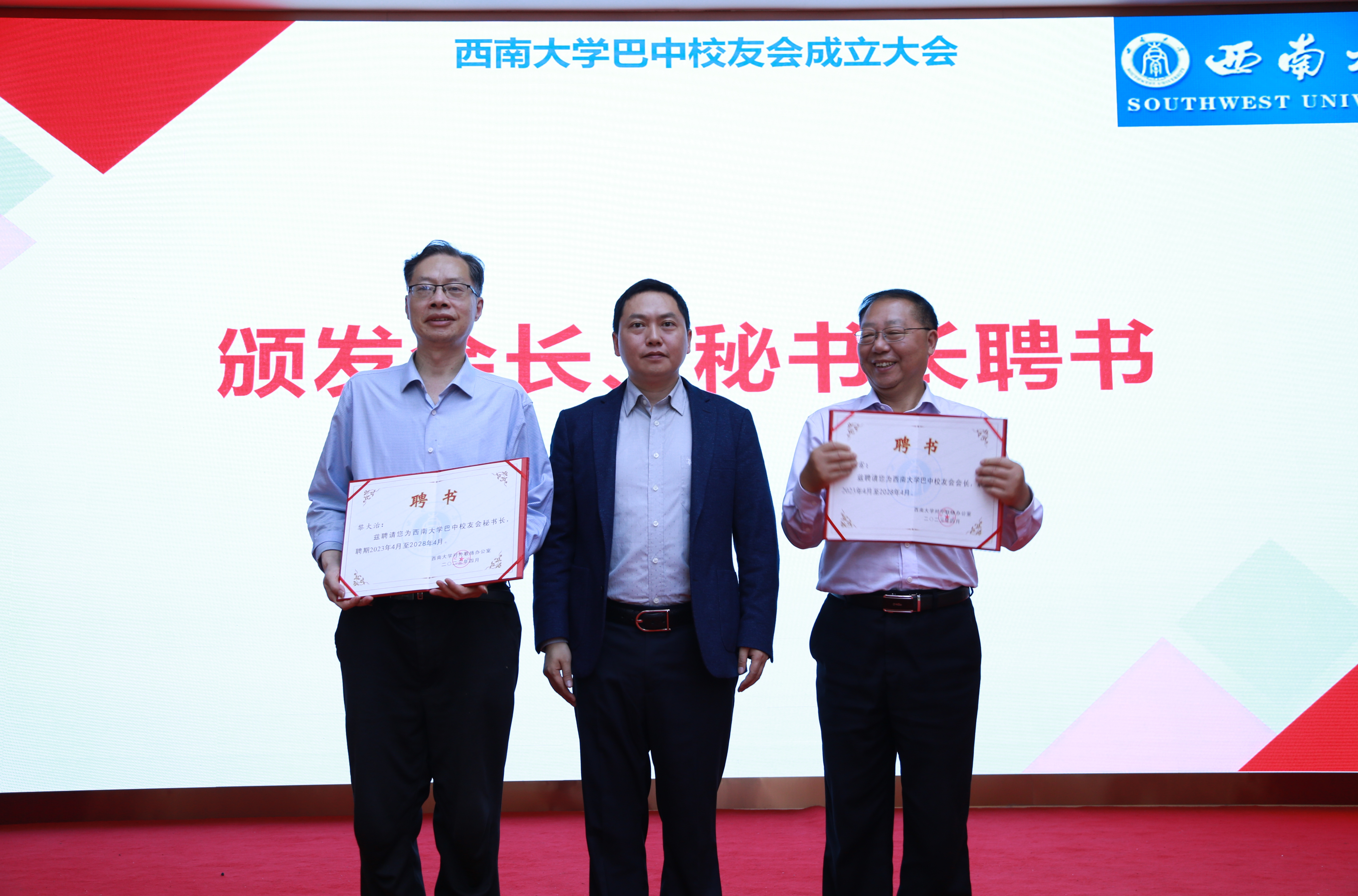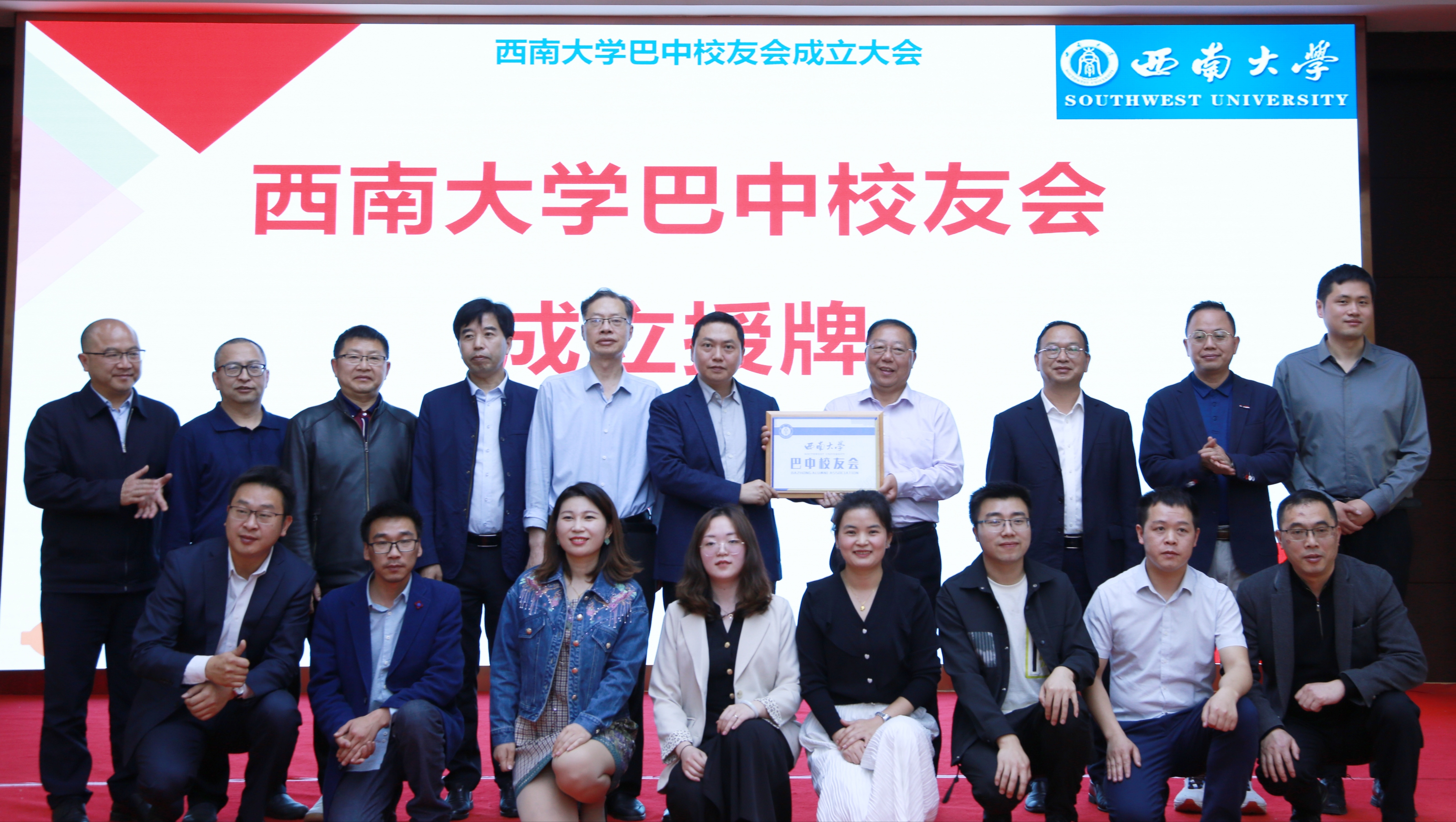 主任唐军为当选会长、秘书长颁发聘书,并为巴中校友会集体授牌。