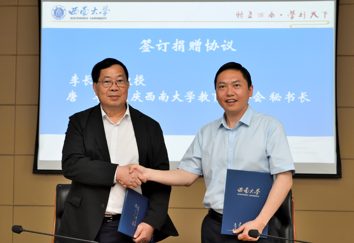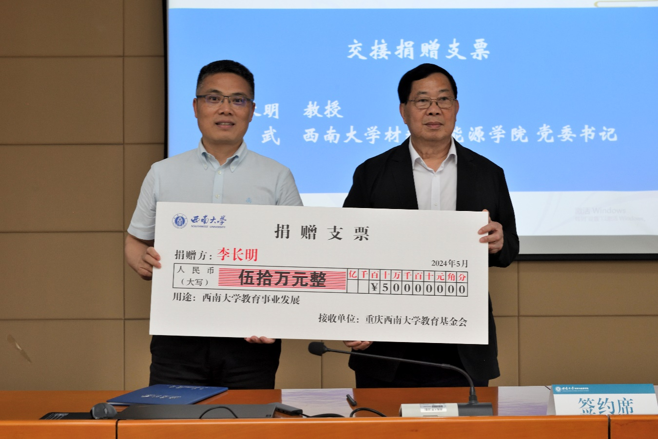 会上,李长明与唐军签署了捐赠协议,随后向材料与能源学院递交了捐赠支票,黄杰代表学校向李长明颁发了捐赠荣誉证书。李长明教授此次捐赠50万元设立长明奖学金是对教育事业的无私奉献和对西大青年学子的殷切期望,他希望长明奖学金的设立能鼓励那些在学习上勤奋刻苦、在品德上高尚优秀的学生,同时也帮助那些家庭经济困难但怀揣梦想的学子们完成学业,更希望通过此次捐赠,激励更多的学生投身科学研究,不断探索未知、追求真理。