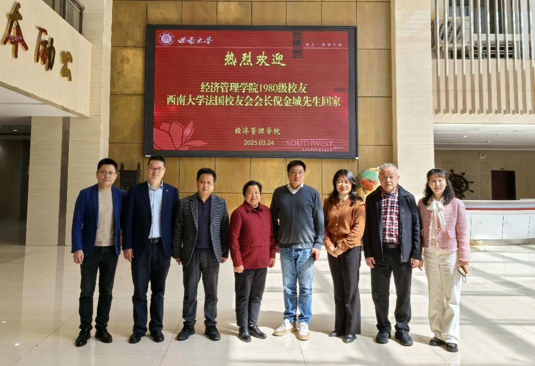 2025年3月24日,经济管理学院1980级校友、betway西汉姆联法国校友会会长倪金城回到学院开展交流活动。betway西汉姆联校友总会副会长、经济管理学院校友分会会长丁忠民教授,倪金城校友就读时的科任教师戴思锐先生、班主任陈淑兰女士,betway西汉姆联对外联络办公室副主任高德香,学院党委书记卢跃进、院长杨丹教授、原院长祝志勇教授、副院长黄庆华教授,学校对外联络办公室校友联络科科长谷剑飞参加座谈交流。
