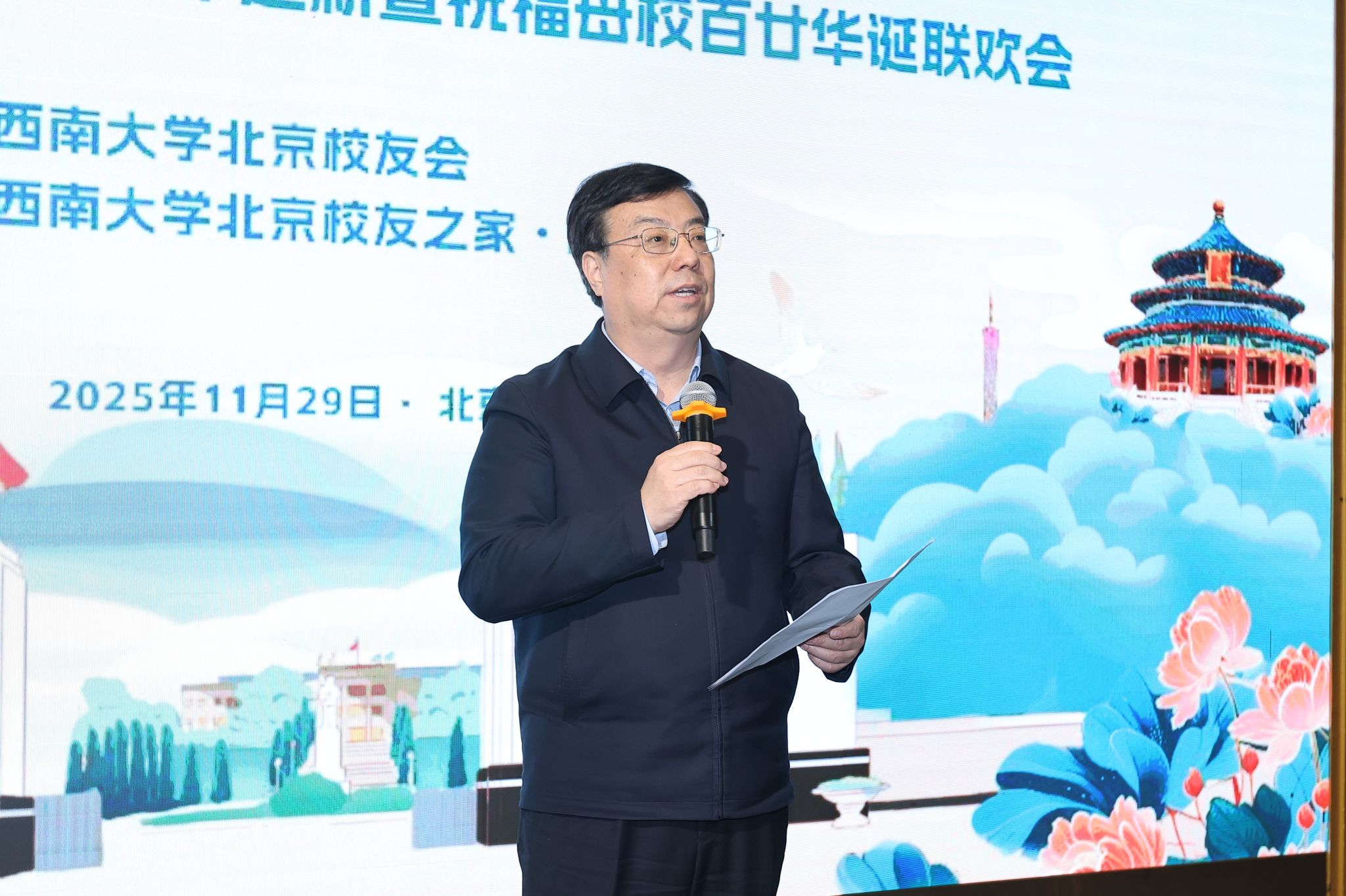 王进军校长代表学校和校友总会发表致辞。他首先向在北京奋斗打拼的全体校友致以诚挚问候,向2025届新校友加入北京校友大家庭表示热烈欢迎。他表示,北京校友会是母校在首都的重要“窗口”,多年来始终凝聚校友力量、助力母校发展,涌现出一大批行业领军人才和骨干力量,为国家建设与社会发展贡献了西大智慧与西大力量。他希望北京校友会继续发挥桥梁纽带作用,让“西大之家”的温暖持续传递;鼓励新校友传承“含弘光大,继往开来”的校训精神,在新的岗位上脚踏实地、追求卓越,同时常念母校情、常回母校看看;号召全体在京校友携手同心,以实际行动为母校百廿华诞增光添彩,共同书写母校高质量发展的新篇章。