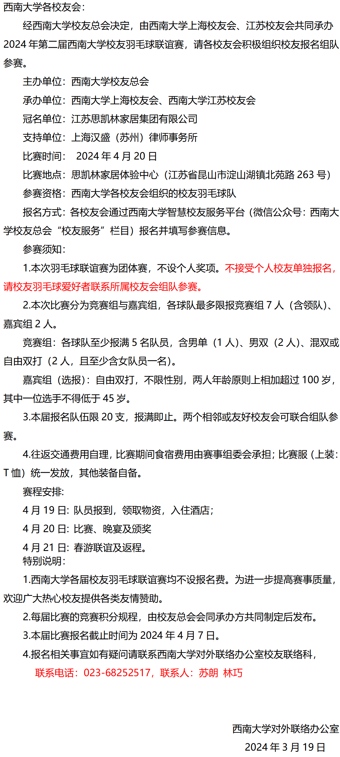 2024年“思凯林杯”betway西汉姆联校友羽毛球联谊赛报名通知